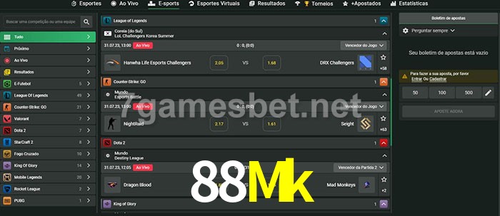 O 88Mk oferece uma grande seleção de opções de apostas em e-sports com probabilidades competitivas